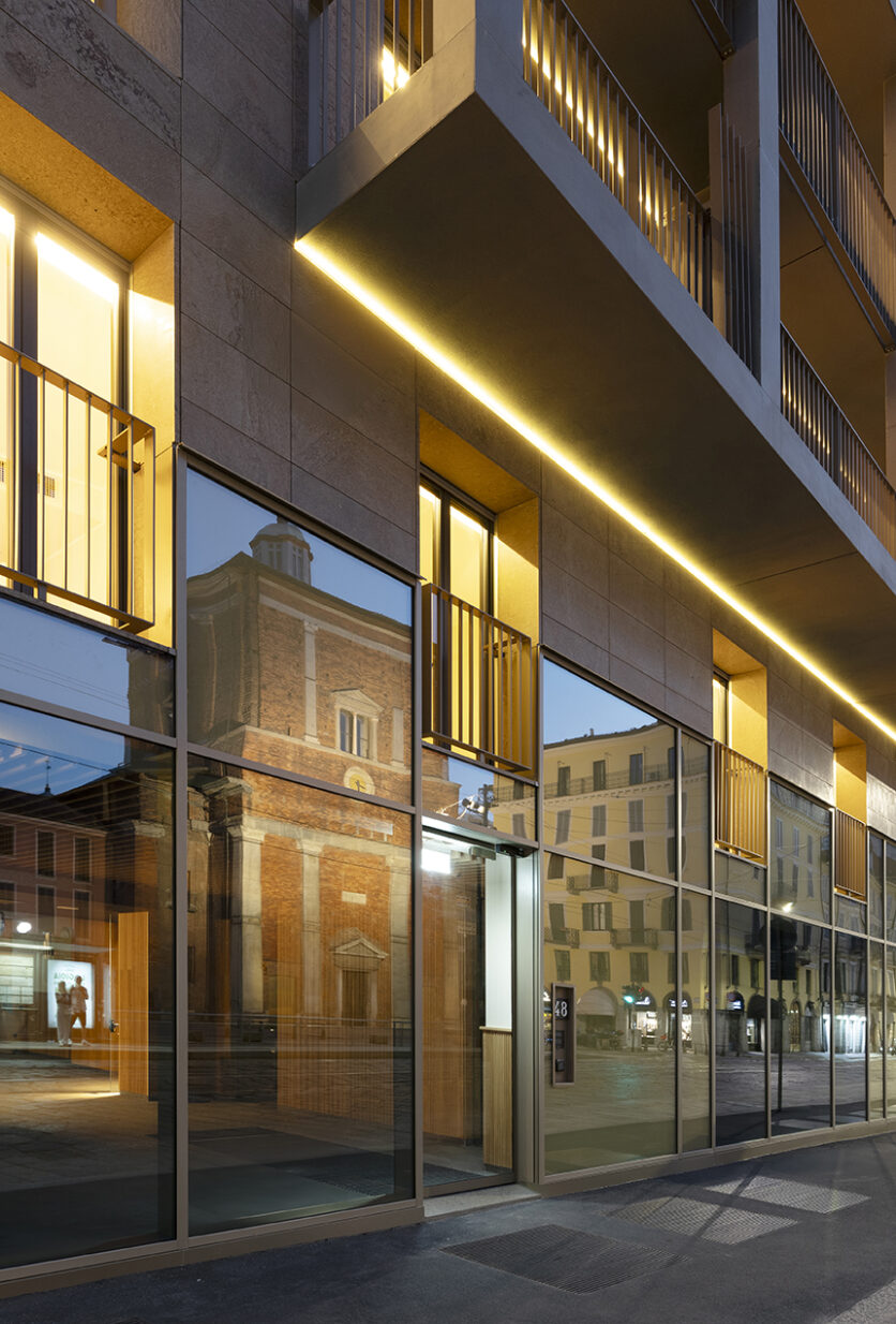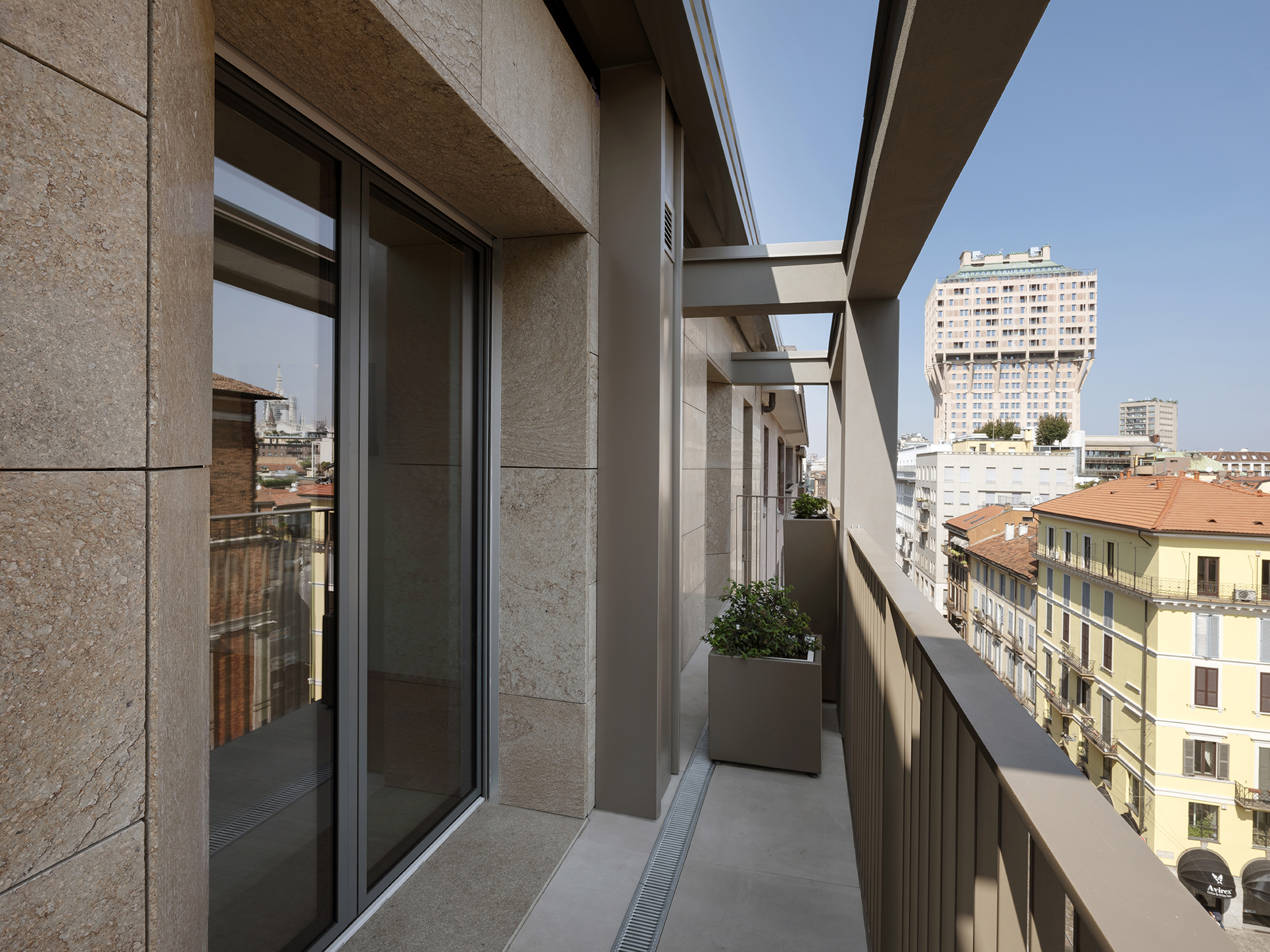 L’edificio è attraversato da una griglia compositiva rigorosa che organizza aperture e pieni secondo un ritmo controllato. La facciata, caratterizzata da una scansione modulare, riflette una volontà di ordine che dialoga con il contesto urbano milanese senza mimetizzarsi, ma reinterpretandone i codici attraverso un linguaggio contemporaneo. Le bucature diventano così elementi di profondità, capaci di generare soglie intermedie tra interno ed esterno.