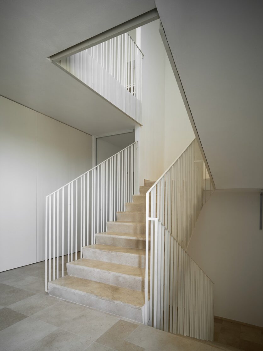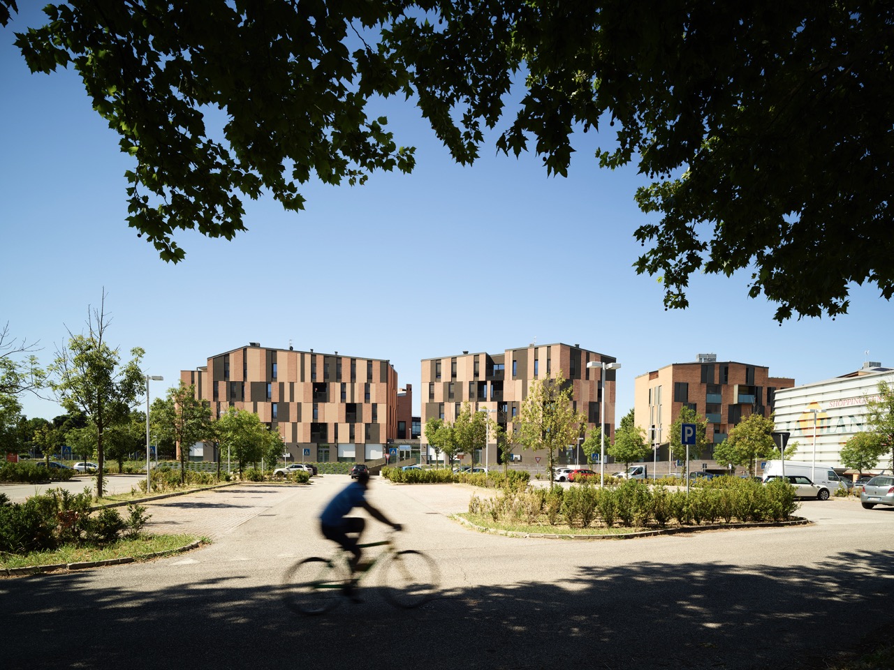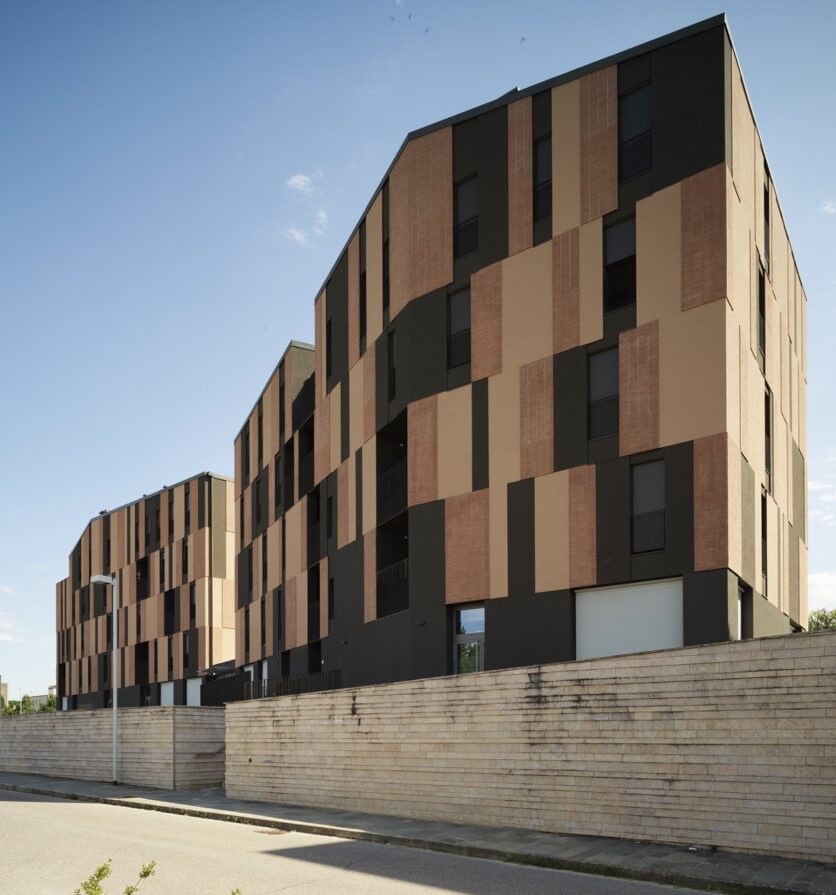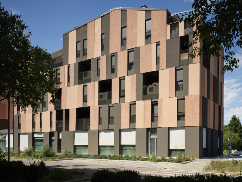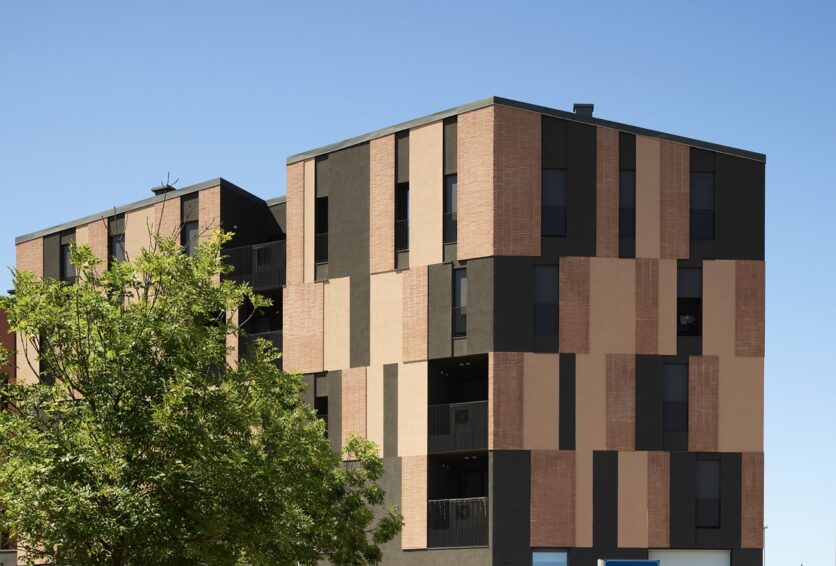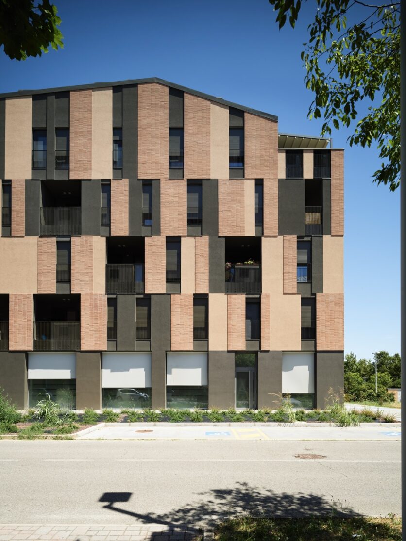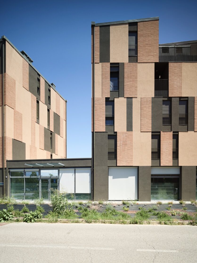 La scelta dei materiali è ridotta e intenzionale. Cappotto tinteggiato, laterizio faccia a vista e alluminio verniciato costituiscono un vocabolario limitato, utilizzato secondo combinazioni non ripetitive. I listelli di cotto, applicati al cappotto con moduli variabili, generano una superficie vibrante, in cui la materia costruisce una relazione diretta con la luce. Il trattamento cromatico, più scuro al piano terra e articolato ai livelli superiori, rafforza la lettura orizzontale dell’edificio e contribuisce a radicarlo nello spazio urbano, mettendolo in continuità con gli edifici già realizzati nelle fasi precedenti dell’intervento.