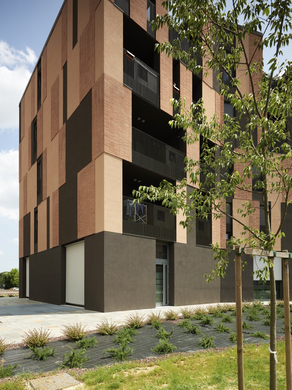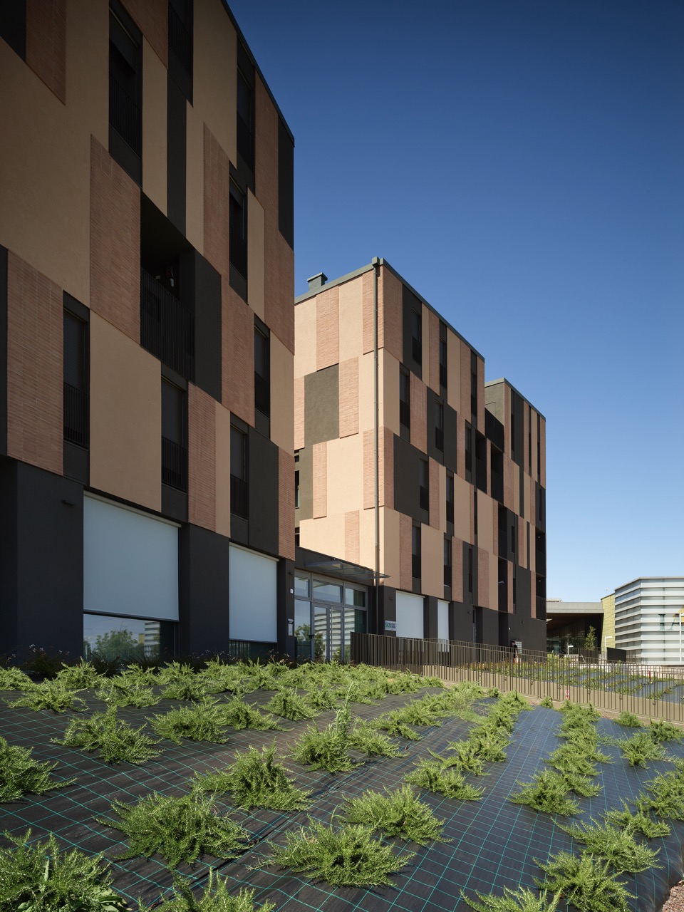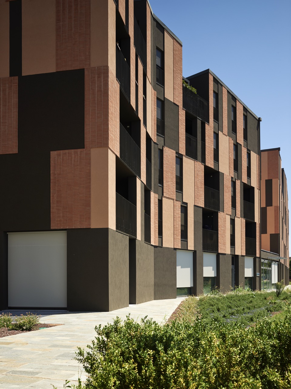 La scelta dei materiali è ridotta e intenzionale. Cappotto tinteggiato, laterizio faccia a vista e alluminio verniciato costituiscono un vocabolario limitato, utilizzato secondo combinazioni non ripetitive. I listelli di cotto, applicati al cappotto con moduli variabili, generano una superficie vibrante, in cui la materia costruisce una relazione diretta con la luce. Il trattamento cromatico, più scuro al piano terra e articolato ai livelli superiori, rafforza la lettura orizzontale dell’edificio e contribuisce a radicarlo nello spazio urbano, mettendolo in continuità con gli edifici già realizzati nelle fasi precedenti dell’intervento.
