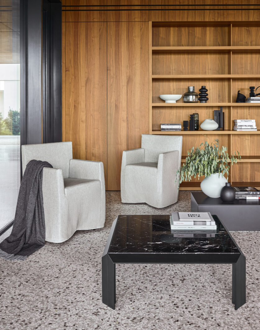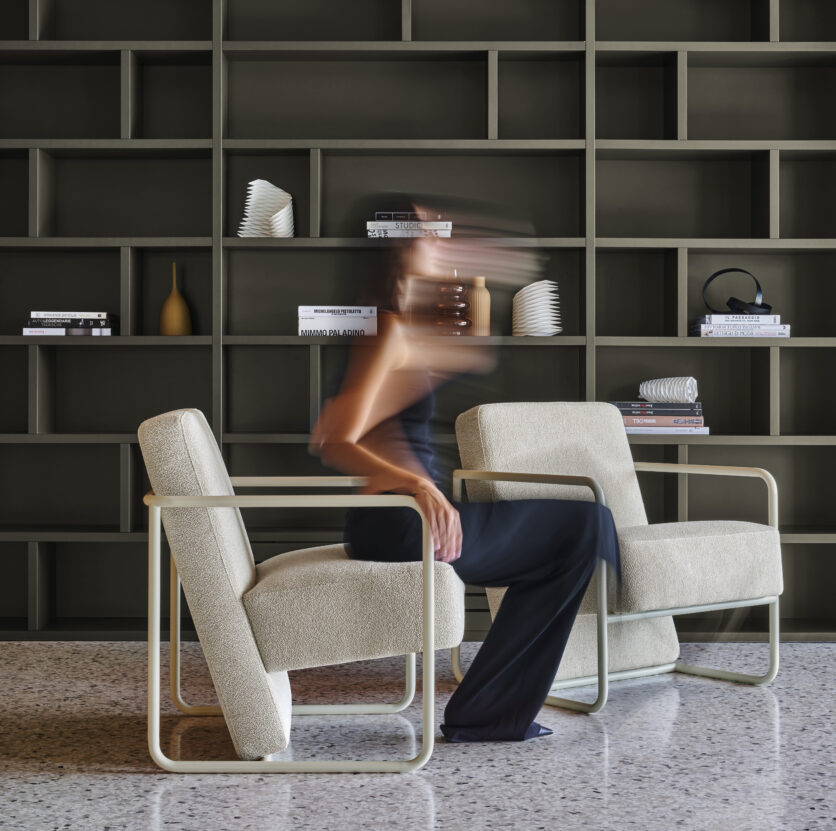 Spunta, also by Odo Fioravanti, is a compact armchair that can be completely disassembled, available in fabric, leather or eco-leather, also in a customisable version. In designing Spunta, Fioravanti tackles the eternal theme of the armchair: suspending two cushions in space — one horizontal and one vertical — finding a new harmony between solids and voids. Two minimal design gestures give shape to the object: the backrest extends to the ground, while the seat and backrest fit into a cubic tubular metal frame that acts as an armrest and structure. The result is an essential and iconic armchair, where rationality and comfort coexist in balance.