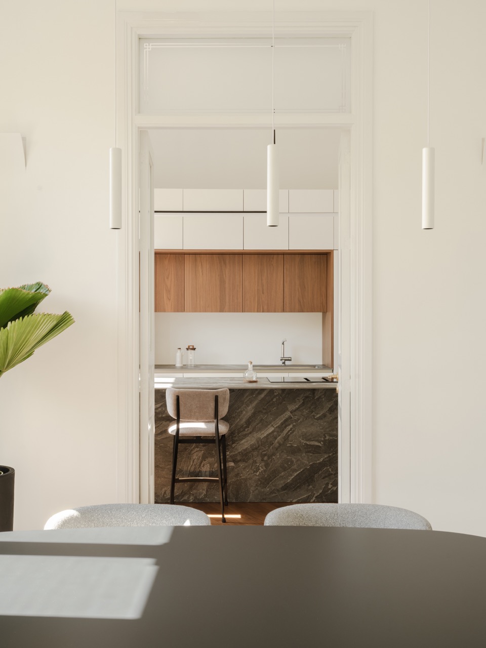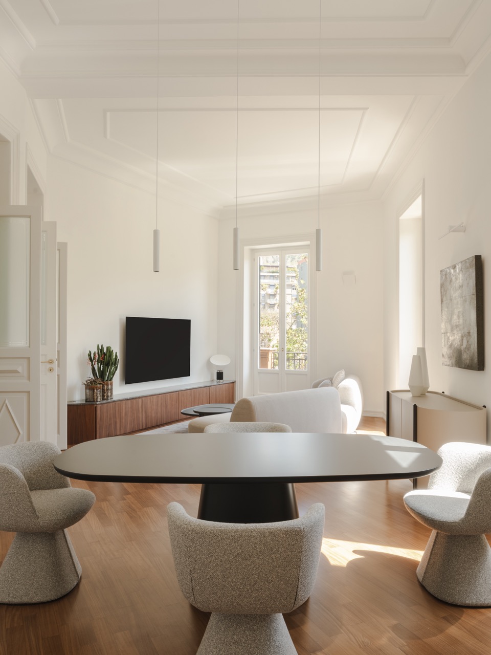 Natural materials such as wood and stone establish the new language of the home, while the high decorated ceilings guide the light toward carefully placed exposed fixtures. Custom-made furnishings and finely tuned design choices interpret the complexity of the layout without ever betraying its character.