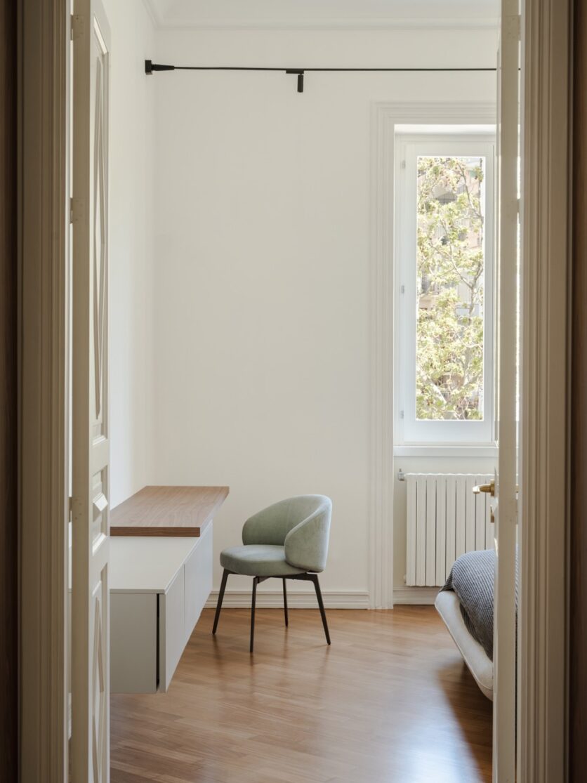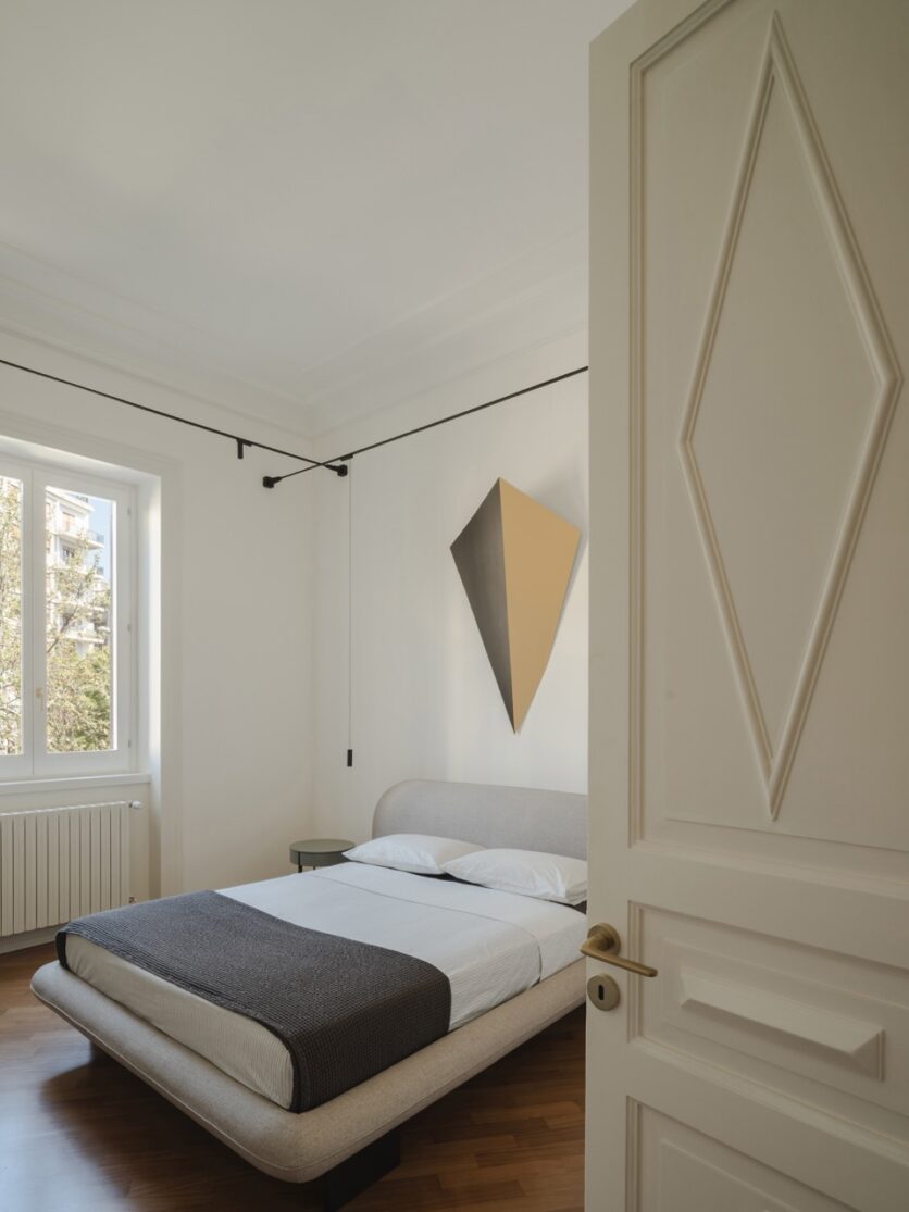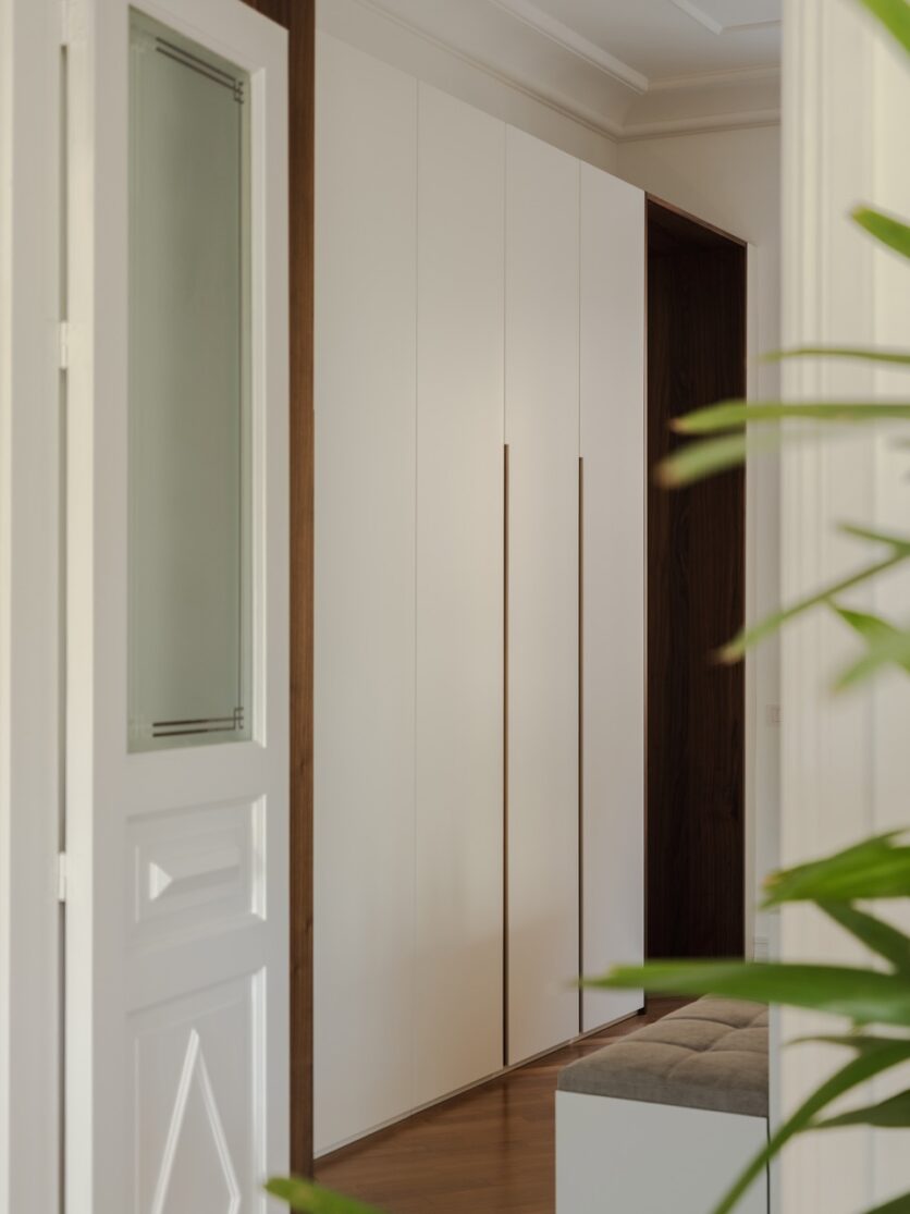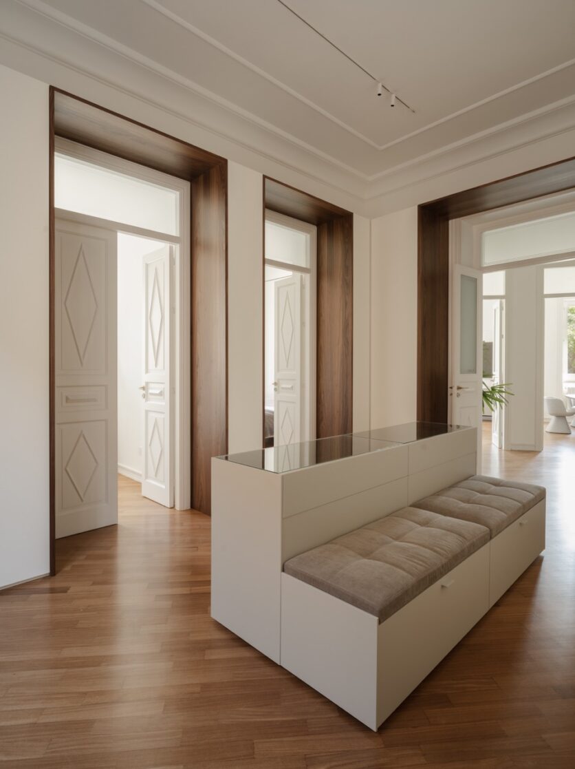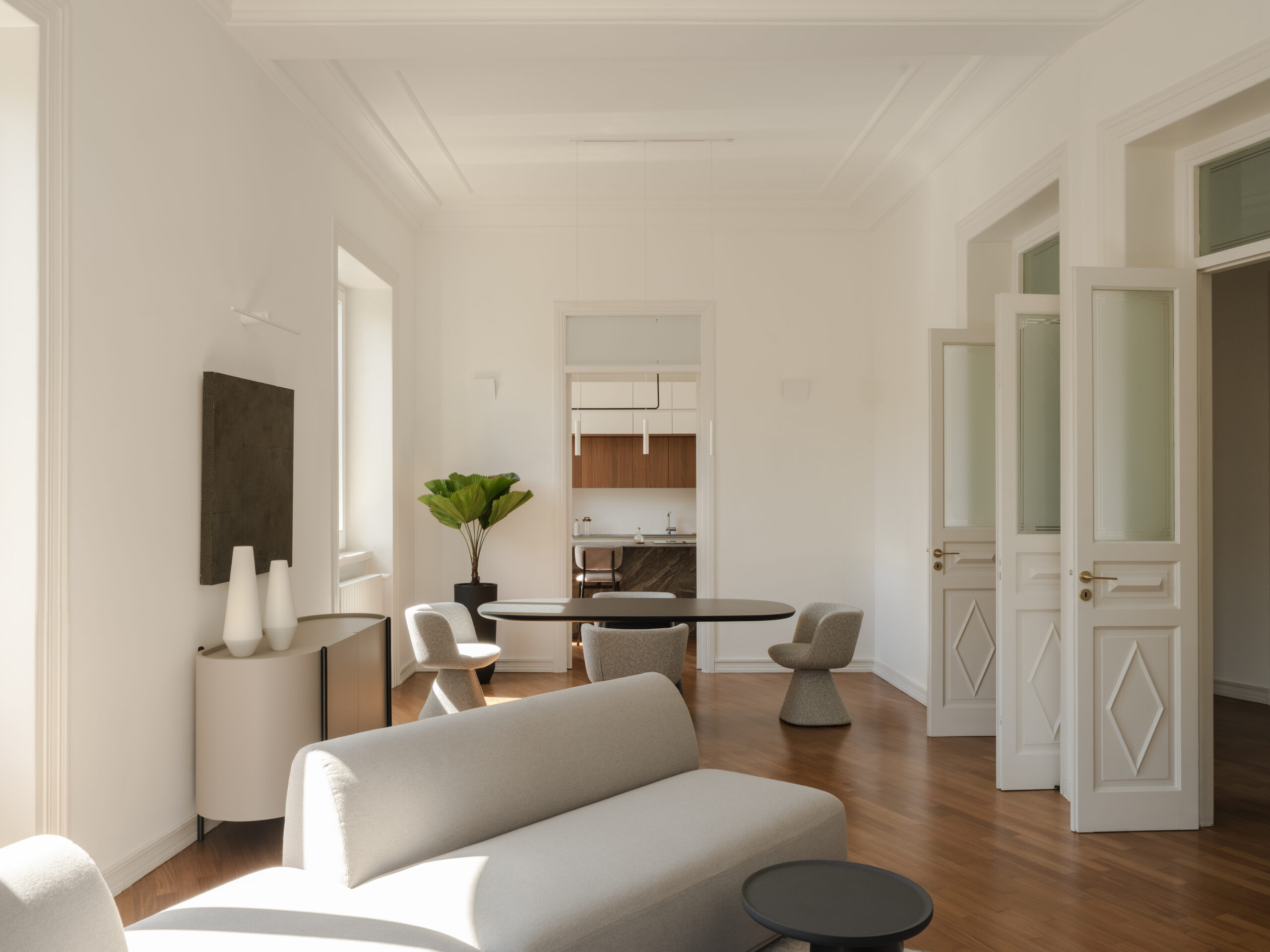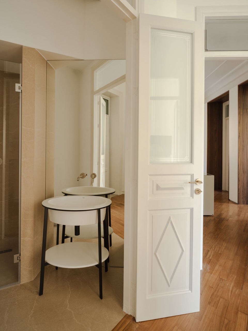 The night area gathers into more private spaces: the master bedroom, a large custom-designed walk-in wardrobe, and two additional rooms with ensuite bathrooms, defining a more intimate rhythm in dialogue with delicate decorative details and the original doors.
