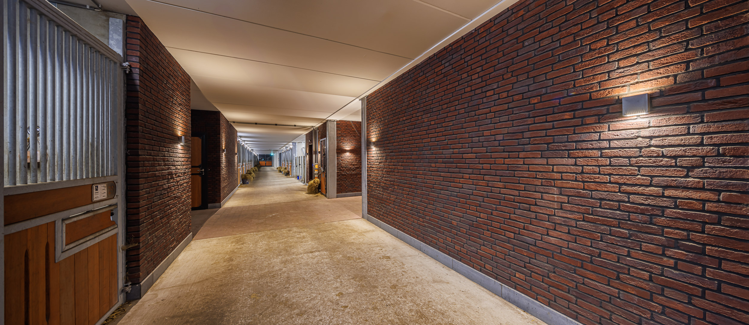 All’interno, la progettazione luminosa è orientata al comfort e alla funzionalità. Nell’arena equestre, cuore pulsante del maneggio, gli apparecchi LAMA+ diffondono una luce uniforme e controllata, evitando fenomeni di abbagliamento e garantendo condizioni ottimali per cavalli e cavalieri durante allenamenti e competizioni. Nelle scuderie e negli ambienti comuni, la scelta di MIMIK 10 FLAT e MIMIK 10 CEILING assicura un’illuminazione equilibrata e confortevole, supportata da downlight che completano il progetto con uniformità e precisione.