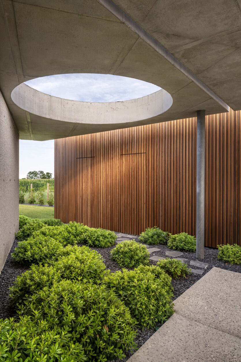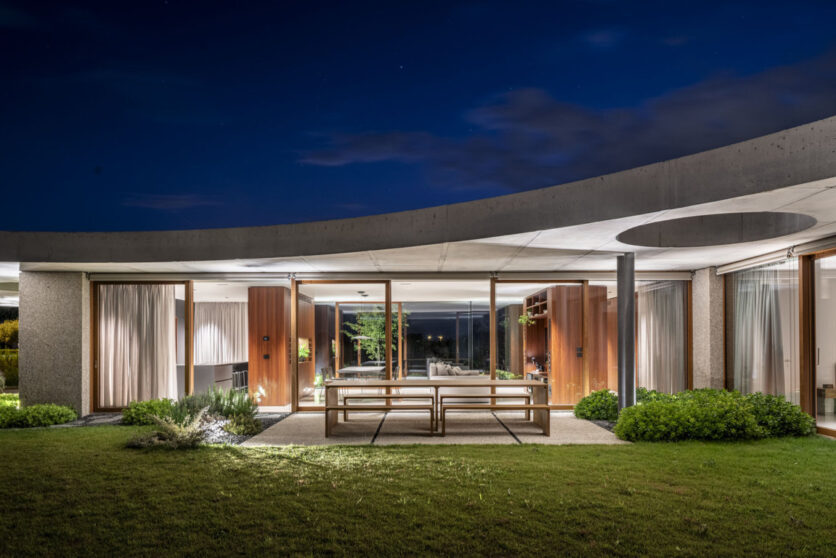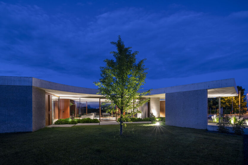 A completare la composizione, il volume del garage si distingue per il rivestimento in listelli verticali di legno di iroko, materiale scelto per la sua durabilità e la sua presenza materica. L’illuminazione perimetrale, con proiezione radente dal basso, enfatizza la curvatura della copertura e genera un raffinato gioco di ombre e riflessi sulle superfici in cemento, arricchendo la percezione volumetrica nelle ore serali e restituendo al vivere quotidiano il valore del silenzio, della luce e del tempo.