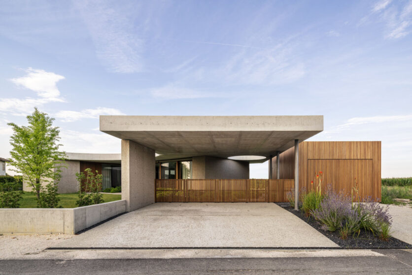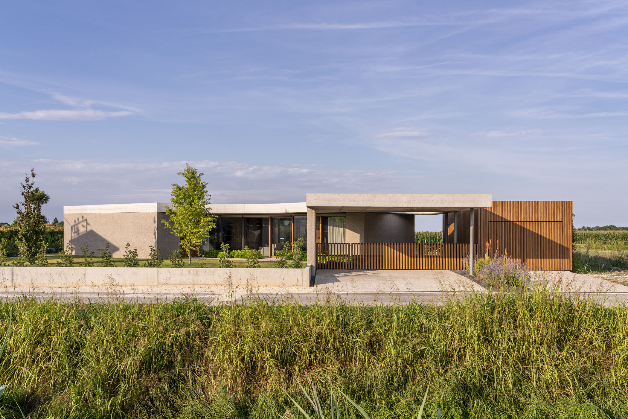Progettata dallo studio ANK Studio, Casa EF sorge nella campagna di Eraclea come un gesto architettonico puro e misurato. Una copertura continua e curvilinea raccoglie e protegge tutti gli ambienti, definendo la cifra espressiva dell’intervento e traducendo in forma costruita l’idea di un’abitazione intima, aperta e in dialogo con il paesaggio circostante.