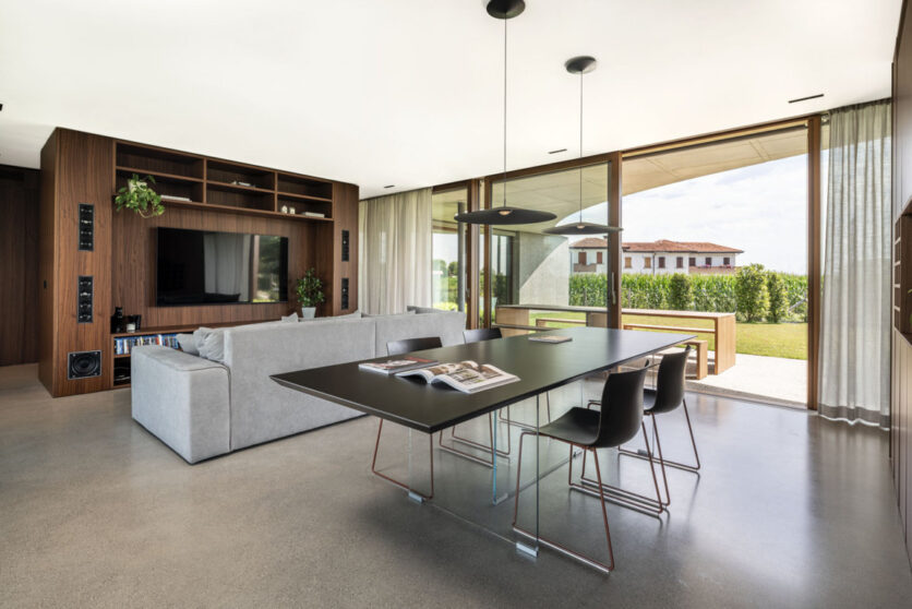 L’approccio compositivo è fondato sulla sottrazione: il progetto elimina il superfluo per esaltare la forza dei materiali, della luce e delle geometrie. Il grande vassoio in cemento lisciato a vista si piega e si modella in funzione degli spazi sottostanti, diventando un elemento unitario che abbraccia il corpo della casa. Le pareti perimetrali in cemento lavato instaurano un rapporto diretto con la campagna veneta, reinterpretando le texture delle architetture rurali attraverso un linguaggio contemporaneo e raffinato.