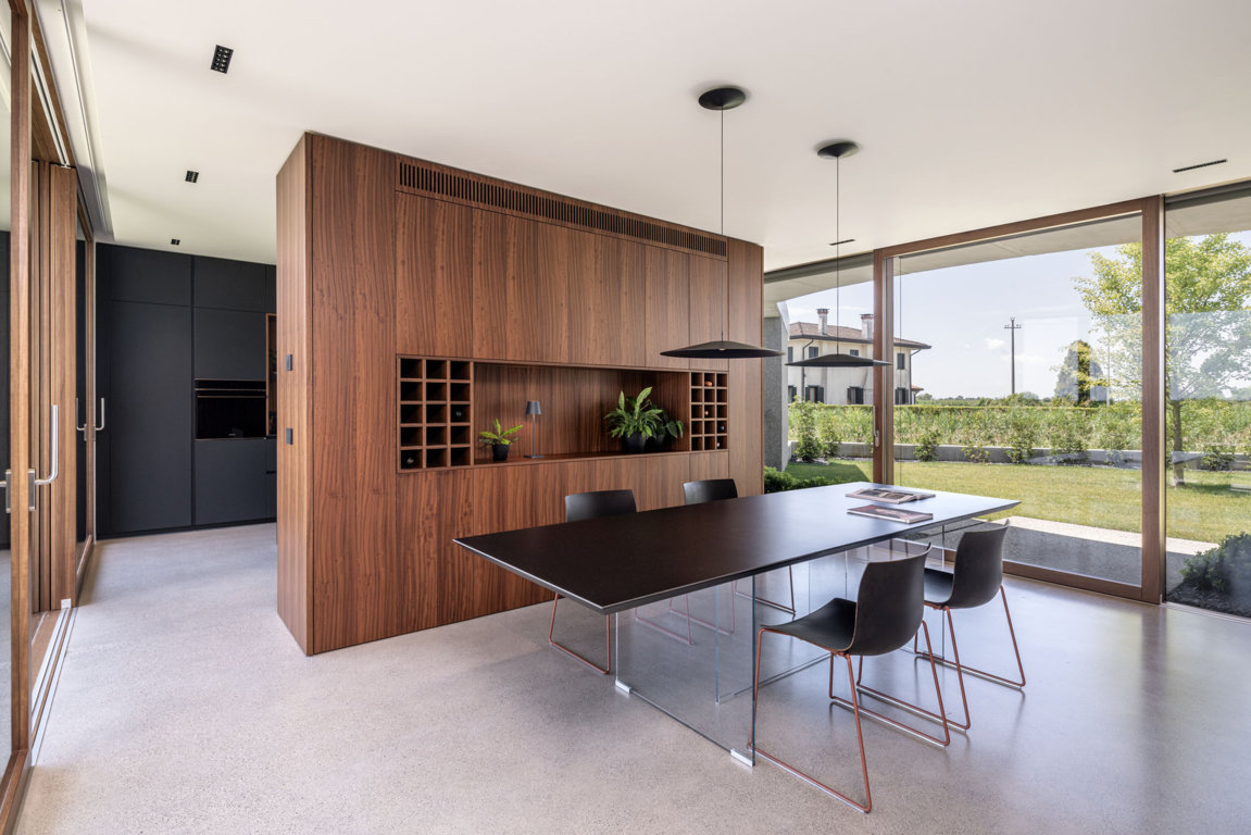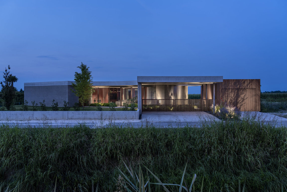 L’approccio compositivo è fondato sulla sottrazione: il progetto elimina il superfluo per esaltare la forza dei materiali, della luce e delle geometrie. Il grande vassoio in cemento lisciato a vista si piega e si modella in funzione degli spazi sottostanti, diventando un elemento unitario che abbraccia il corpo della casa. Le pareti perimetrali in cemento lavato instaurano un rapporto diretto con la campagna veneta, reinterpretando le texture delle architetture rurali attraverso un linguaggio contemporaneo e raffinato.