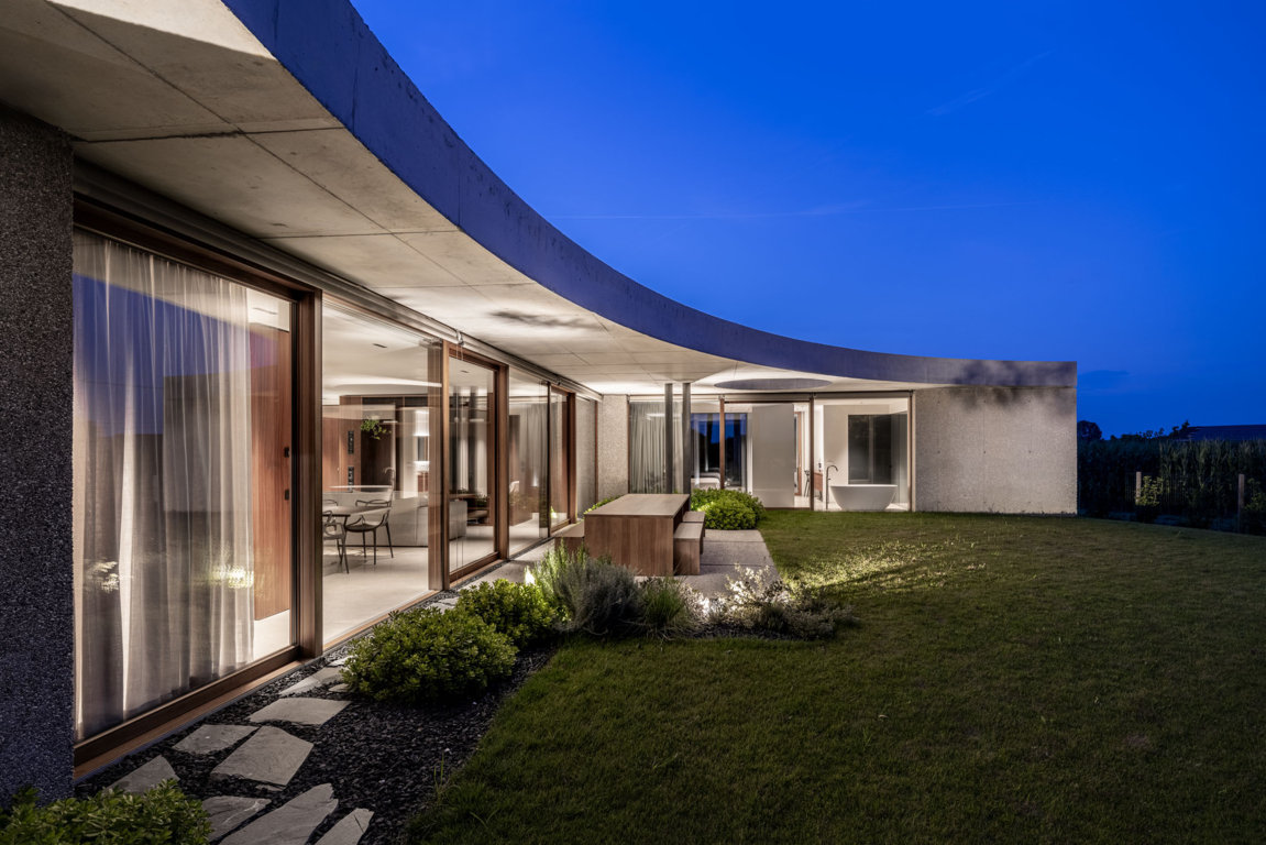 A completare la composizione, il volume del garage si distingue per il rivestimento in listelli verticali di legno di iroko, materiale scelto per la sua durabilità e la sua presenza materica. L’illuminazione perimetrale, con proiezione radente dal basso, enfatizza la curvatura della copertura e genera un raffinato gioco di ombre e riflessi sulle superfici in cemento, arricchendo la percezione volumetrica nelle ore serali e restituendo al vivere quotidiano il valore del silenzio, della luce e del tempo.