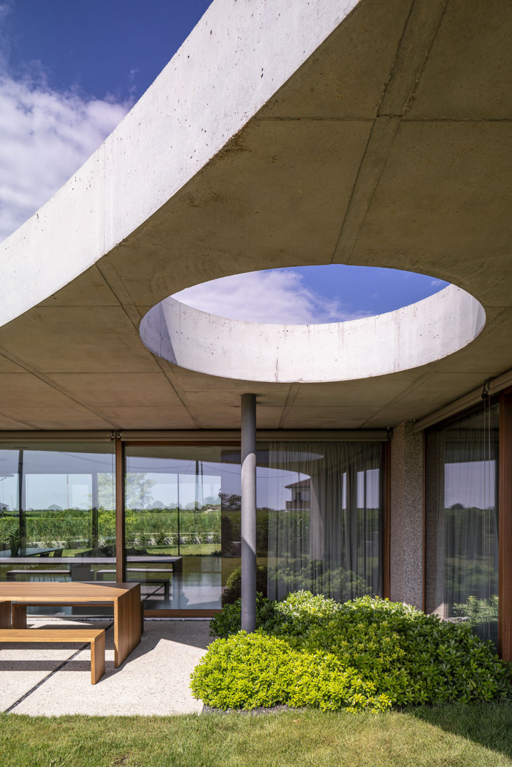 In alcuni punti, la copertura si interrompe per lasciare spazio a grandi oculi circolari che incorniciano frammenti di cielo e modulano la luce naturale. Queste aperture verticali trasformano la copertura da semplice elemento strutturale a dispositivo sensibile, capace di generare atmosfere variabili e di animare la percezione degli spazi interni nel corso della giornata.
