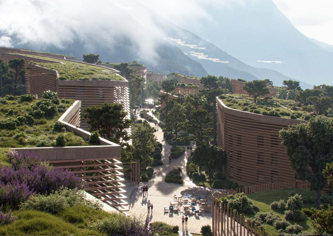 Dal punto di vista architettonico, NOA adotta un linguaggio organico: i volumi sembrano estrusi dal terreno, seguendo la pendenza naturale del sito. Le facciate in doghe di legno e le coperture verdi accessibili riducono l’impatto visivo e ampliano gli spazi, mentre la disposizione degli edifici preserva le visuali panoramiche e massimizza luce e ventilazione.