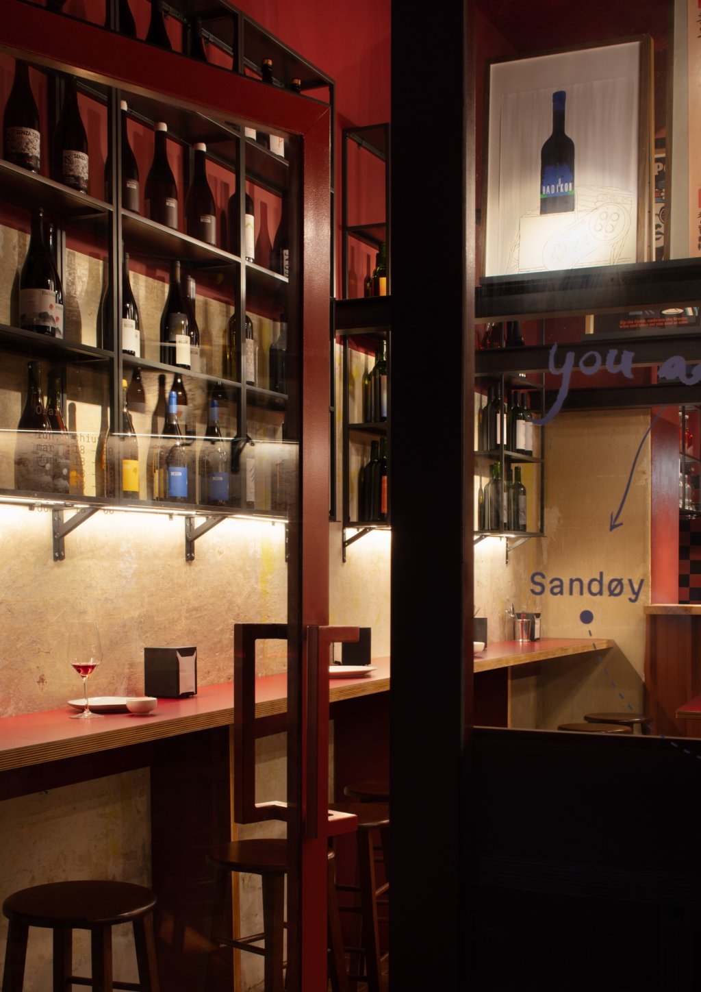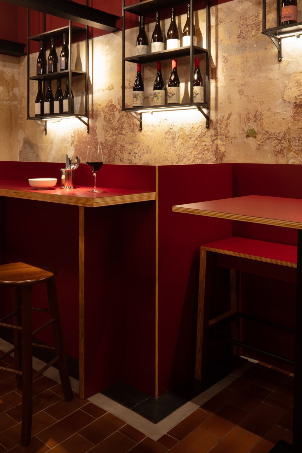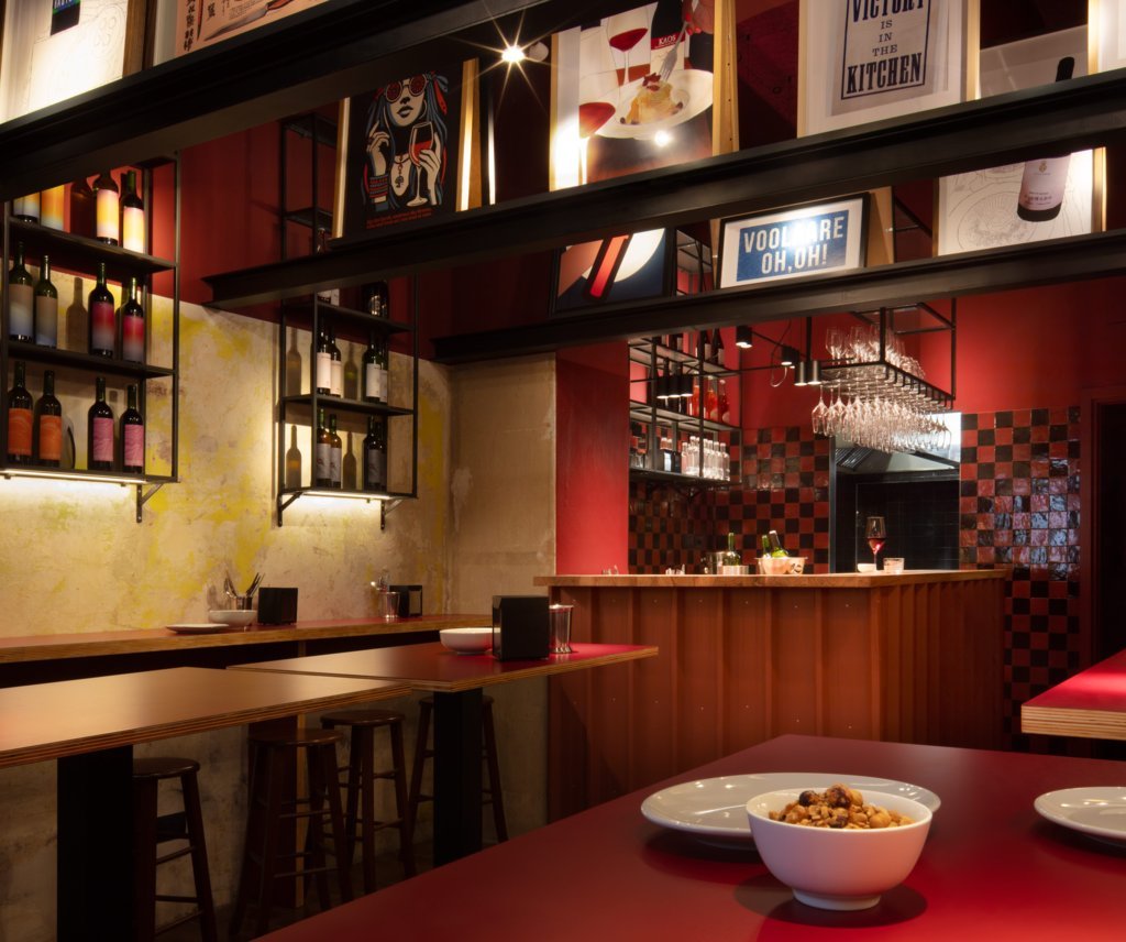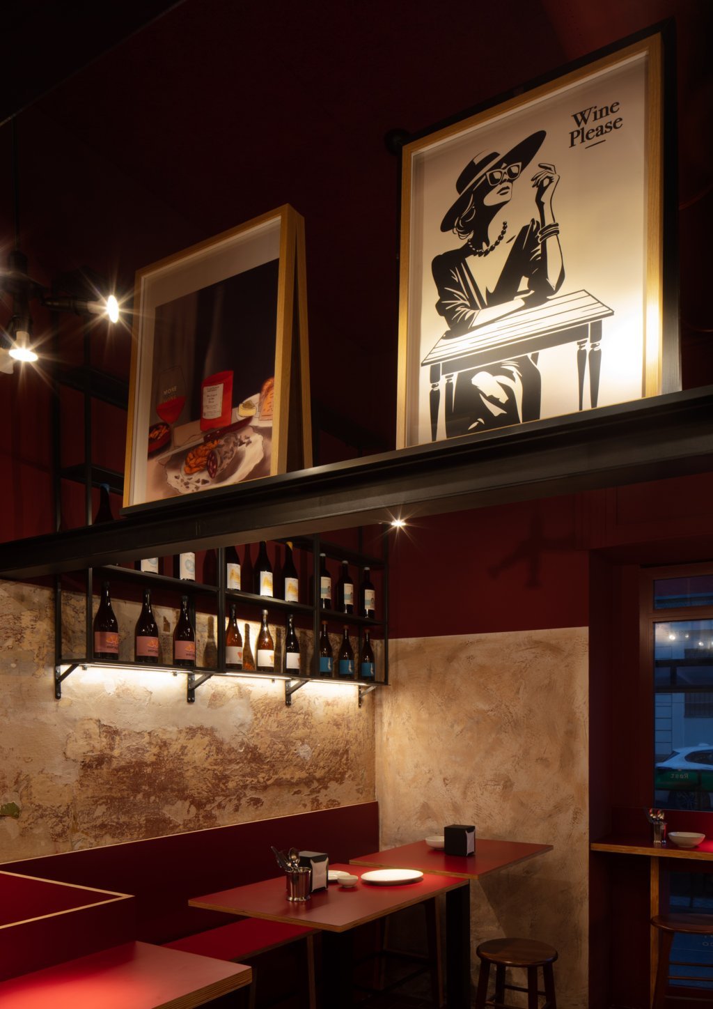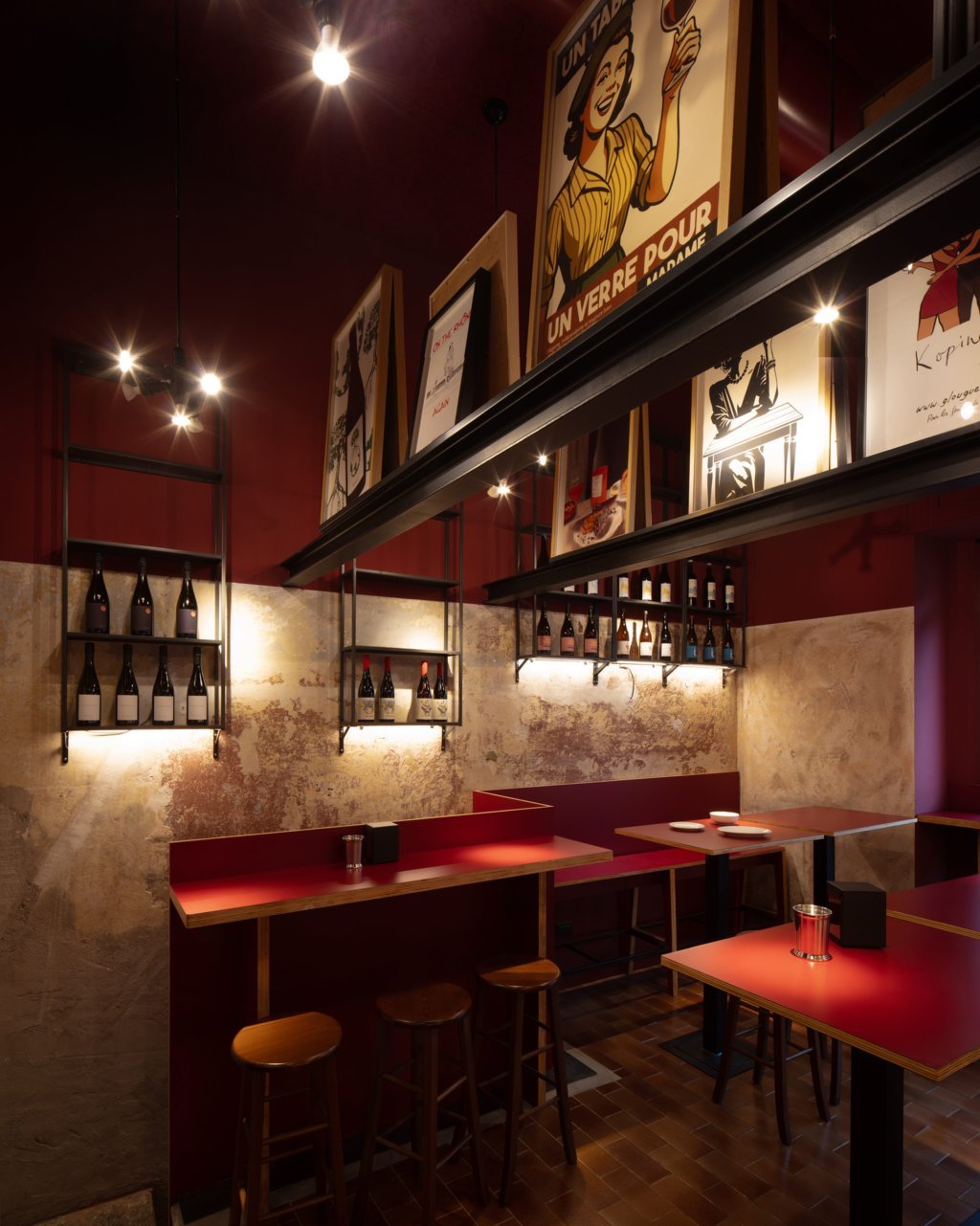 La palette cromatica combina rossi profondi, neri e tonalità terrose. I tavoli e le mensole, realizzati in multistrato rivestito in laminato plastico, richiamano i bar del dopoguerra reinterpretandone lo spirito in chiave contemporanea. Le librerie in ferro nero ospitano la selezione di vini, mentre lampade a sospensione contribuiscono a creare una dimensione particolare. Un tratto distintivo è la presenza di tre travi in acciaio poste a mezza altezza: trasformate in supporto espositivo, accolgono circa trenta manifesti vintage e contemporanei provenienti da tutta Europa.