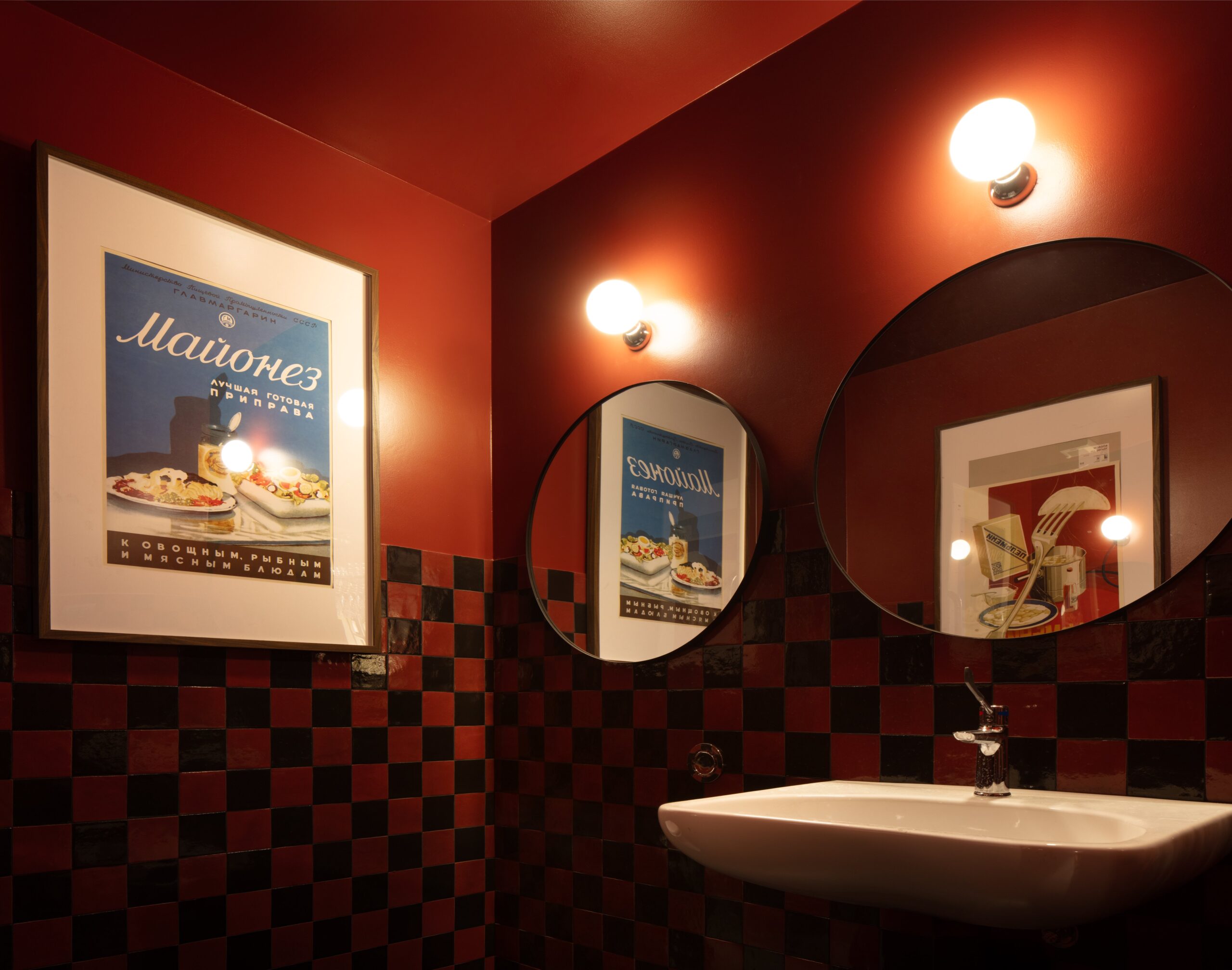 Il layout longitudinale accompagna i visitatori dall’ingresso verso il banco bar, anticipando la cucina. Nella prima parte trovano posto tavoli, mensole laterali e sedute alte; nella seconda, la zona operativa rivestita da una scenografica fascia a scacchi rosso e nero che definisce il carattere grafico del progetto. L’ambiente ospita complessivamente 25 posti a seduta alta.